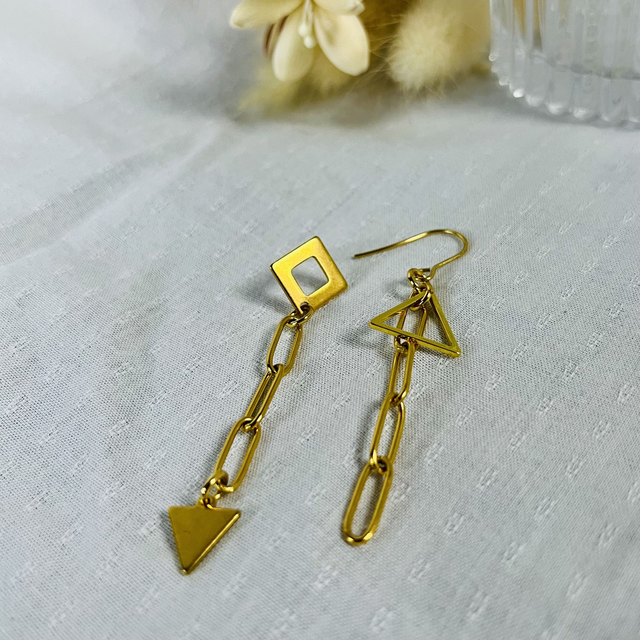 Boucles d’oreilles asymétriques triangle, doré. Longueur: 4,5 cm. Très légères.