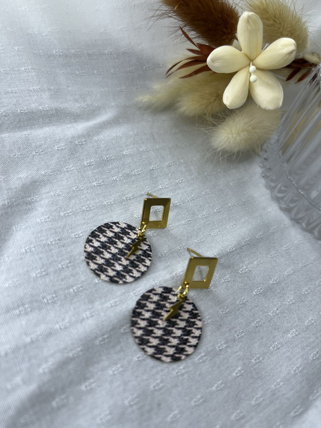 Boucles d’oreilles acier inoxydable doré. Breloque motif pied de poule et mini éclair acier inoxydable doré. Longueur : 2cm (diamètre : 2cm)
