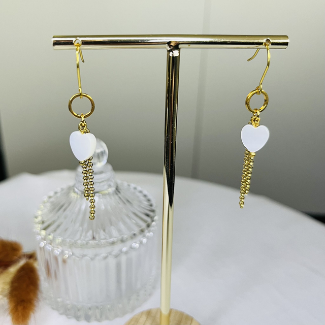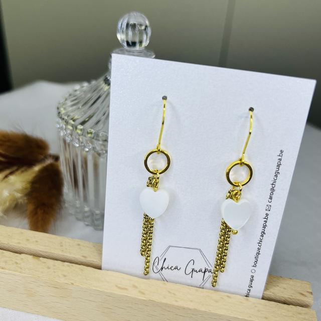 Jolies boucles d’oreilles en acier inoxydable doré. Cœur blanc en coquillage.