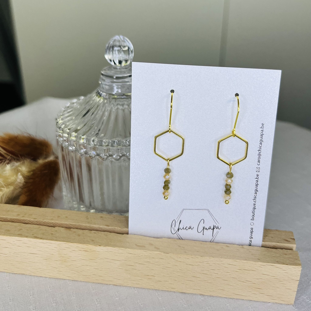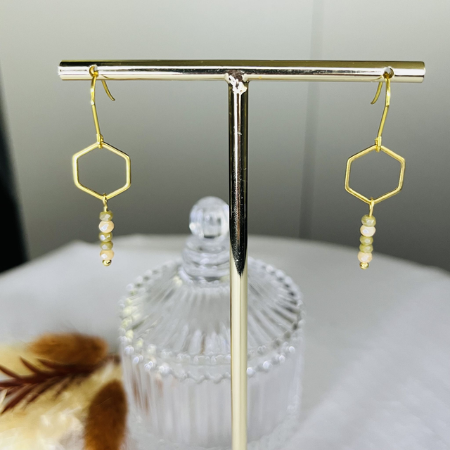 Jolie boucles d’oreilles en acier inoxydable doré, hexagone doré et perles kaki et beige.