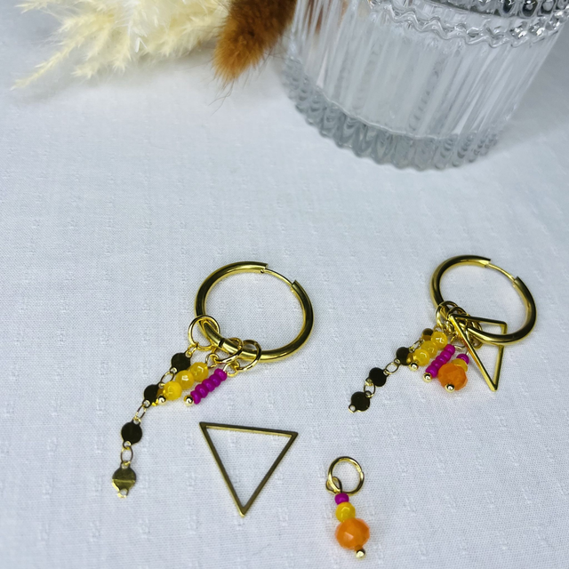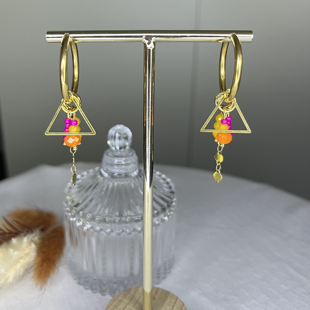 Créoles avec breloques, perles colorées, chaînette et triangle. Acier inoxydable