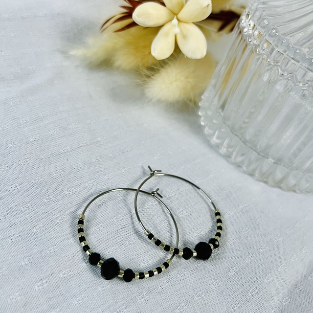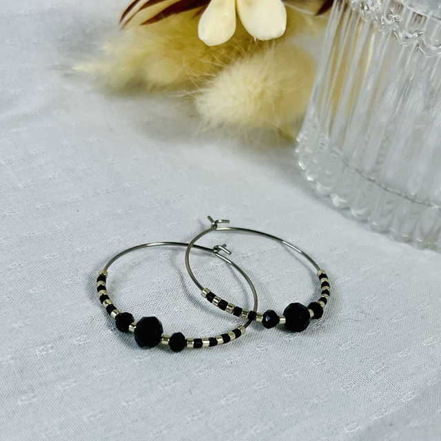Créoles acier inoxydable argenté, avec perles miyuki noires et argentées et perles à facettes noires, style Swarovski. Diamètre des créoles: 3 cm