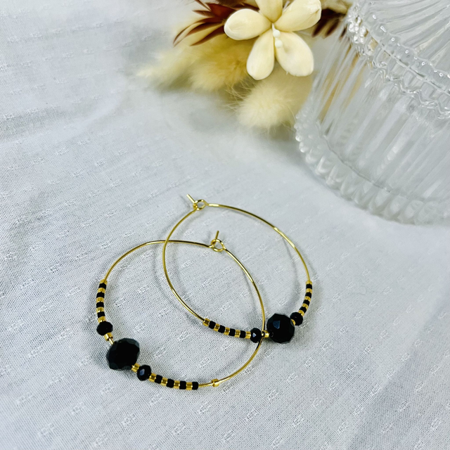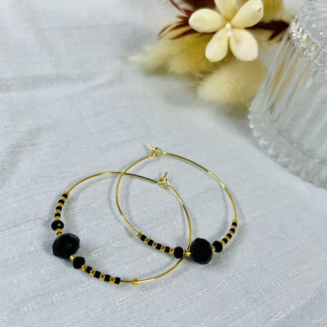 Créoles acier inoxydable doré avec perles miyuki dorées et noires et perles à facettes noires, style Swarovski. Diamètre créoles: 4 cm.