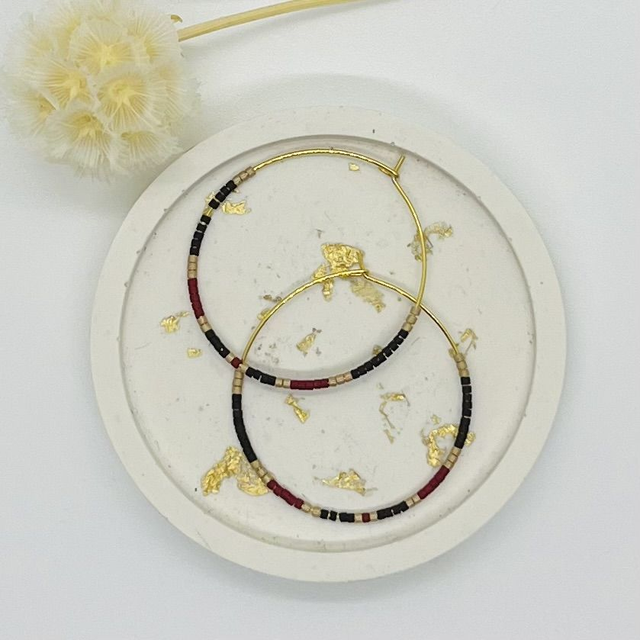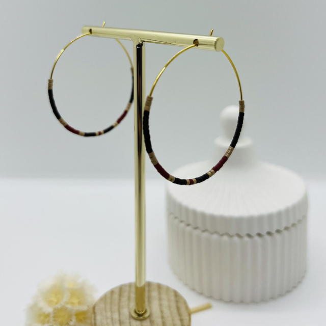 Jolies créoles dorées, perles miyuki brunes, bordeaux et beige