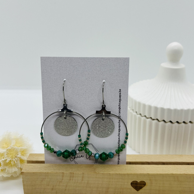 Boucles d’oreilles argentées, perles vertes et argentées