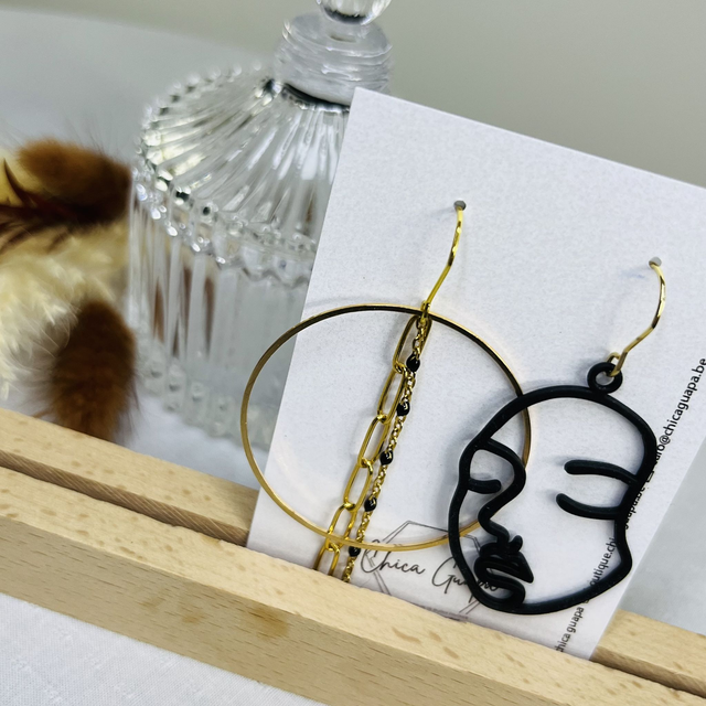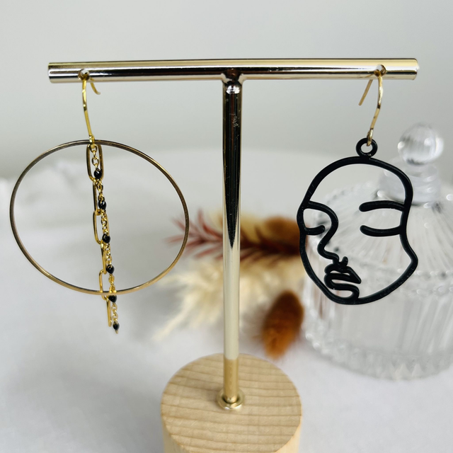 Boucles d’oreilles asymétriques noir et doré. Visage noir, chaînes dorées et noires.